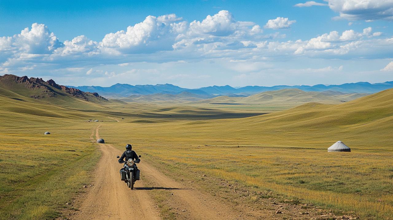 Un voyage moto Mongolie exige une préparation minutieuse, tant sur le plan logistique qu'administratif. Le succès de cette aventure repose sur une organisation réfléchie qui anticipe les défis propres à ce territoire immense et peu peuplé. Les distances parcourues peuvent atteindre 1650 kilomètres selon les itinéraires choisis, voire davantage pour ceux qui s'aventurent jusqu'aux montagnes de l'Altaï. Chaque kilomètre parcouru révèle des paysages grandioses mais impose également une vigilance constante face aux conditions parfois extrêmes.